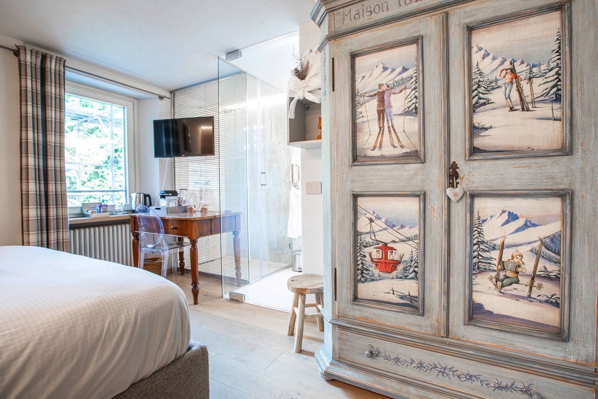 Ogni dettaglio in queste camere è pensato per garantire il massimo del comfort e dell’estetica. Grandi finestre offrono viste mozzafiato sul Monte Bianco, permettendo alla luce naturale di illuminare lo spazio e di offrire uno spettacolo naturale che cambia con le ore del giorno. La scelta dei materiali, come il legno di pino e i tessuti in lana, rievoca l’ambiente montano e contribuisce a un senso di caldo rifugio dopo una giornata trascorsa all’aria aperta.